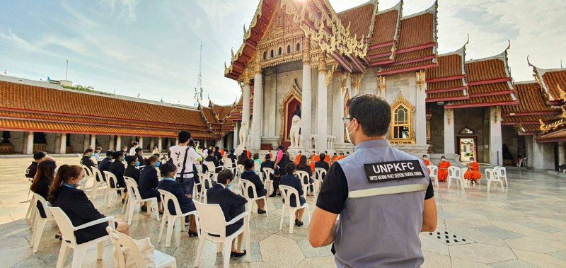 ประธานในพิธีฝ่ายสงฆ์ คือ พระเทพกิตติเวที เจ้าอาวาสวัดเบญจมบพิตรดุสิตวนาราม พระอารามหลวง พร้อมด้วยพระภิกษุสามเณรกว่า79 รูป และก่อนที่ท่านจะให้พรแก่ผู้เข้าร่วมให้การช่วยเหลือในครั้งนี้ ท่านได้แสดงพระธรรมเทศนาถึงความสำคัญของการบำเพ็ญกุศล โดยเฉพาะความเอื้ออาทร “การให้ทาน” ช่วยเหลือผู้ด้อยโอกาสด้วยความเมตตากรุณา ขอบคุณคณะ UNPKFCและคณะทำงานที่มีส่วนเกี่ยวข้อง ที่ได้จัดกิจกรรมบรรเทาทุกข์ต่อผู้ที่ได้รับผลกระทบในสถาณการณ์ที่ยากลำบากในครั้งนี้