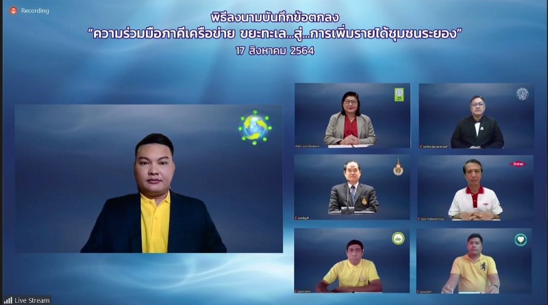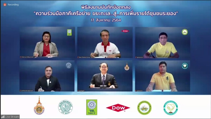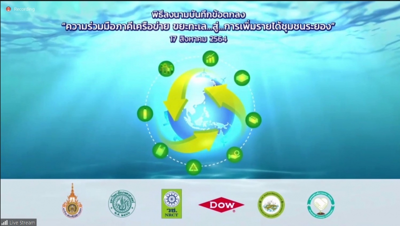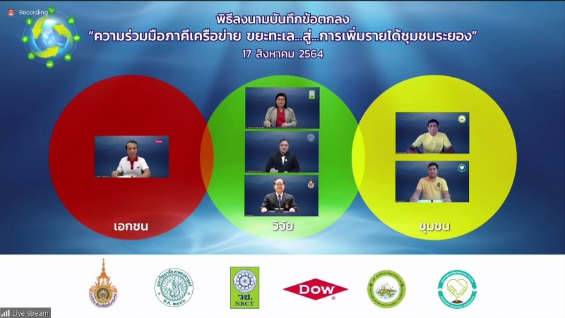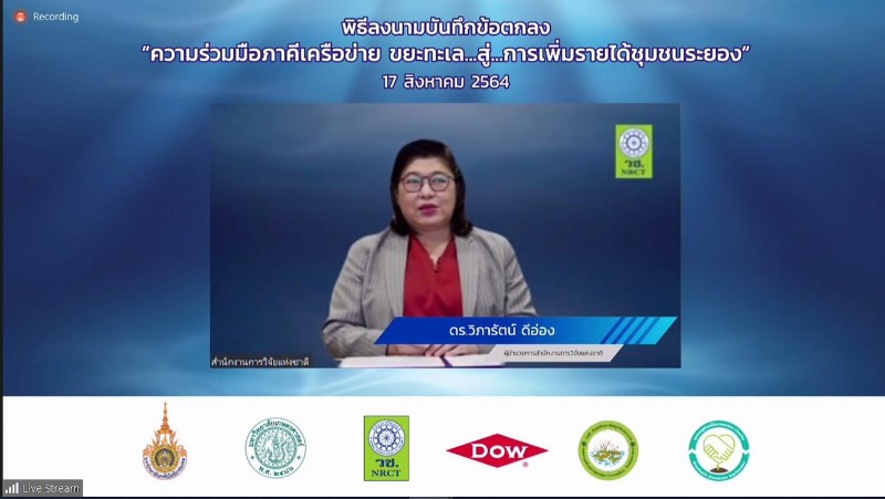 17 สิงหาคม 2564 สำนักงานการวิจัยแห่งชาติ (วช.) กระทรวงการอุดมศึกษา วิทยาศาสตร์ วิจัยและนวัตกรรม พร้อมด้วยประชาคมวิจัย ได้แก่ มหาวิทยาลัยเกษตรศาสตร์ มหาวิทยาลัยเทคโนโลยีราชมงคลธัญบุรี และกลุ่มบริษัท ดาว ประเทศไทย (Dow) ร่วมลงนามบันทึกข้อตกลงความร่วมมือ โครงการ “ขยะทะเล…สู่…การเพิ่มรายได้ชุมชนระยอง” ร่วมกับกลุ่มชุมชน จ.ระยอง ประกอบด้วย วิสาหกิจชุมชนส่งเสริมอาชีพชุมชนเกาะกก และ หมู่บ้านเอื้ออาทรจังหวัดระยอง (วังหว้า) เพื่อถ่ายทอดนวัตกรรมการผลิตวัสดุก่อสร้างจากพลาสติกใช้แล้วให้กับชุมชน หวังสร้างรายได้ ยกระดับคุณภาพชีวิต และลดปัญหาขยะในทะเลไทยอย่างยั่งยืน ผ่านสื่ออิเล็กทรอนิกส์ออนไลน์