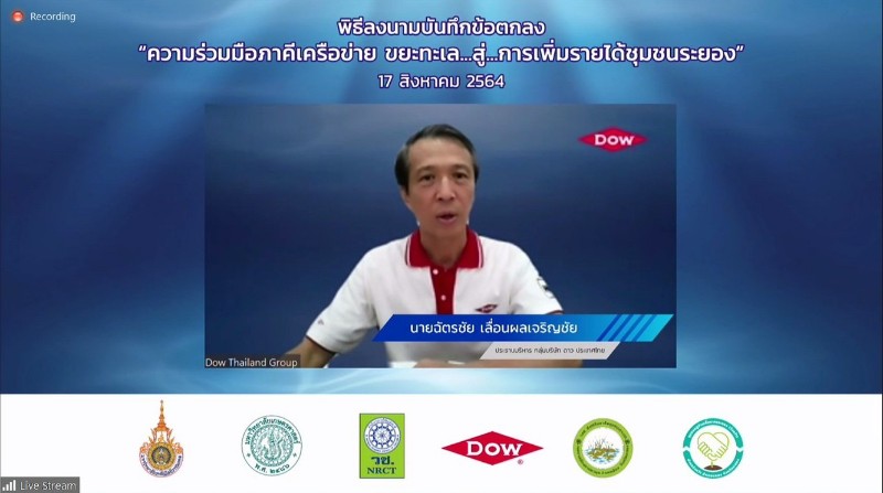ด้าน นายฉัตรชัย เลื่อนผลเจริญชัย ประธานบริหาร กลุ่มบริษัท ดาว ประเทศไทย กล่าวว่า “ในฐานะที่ ดาว เป็นหนึ่งในบริษัทด้าน Materials Science รายใหญ่ที่สุดของโลก เราตระหนักถึงปัญหาพลาสติกใช้แล้วที่หลุดรอดไปสู่สิ่งแวดล้อม และพยายามหาวิธีการต่าง ๆ เข้ามาจัดการอย่างยั่งยืน ดาว ได้ตั้งเป้าที่จะช่วย“หยุดขยะพลาสติก”โดยมุ่งมั่นจะผลักดันให้พลาสติกที่ใช้แล้วจำนวน 1 ล้านตันจากทั่วโลก ให้ถูกเก็บกลับมาใช้ประโยชน์ หรือ รีไซเคิล ซึ่งโครงการ “ขยะทะเล…สู่…การเพิ่มรายได้ชุมชนระยอง” เป็นอีกหนึ่งในโครงการสำคัญที่จะนำผลงานด้านการศึกษาและงานวิจัยมาใช้ประโยชน์ได้จริง เราพร้อมที่จะเป็นฟันเฟืองในการประสานงานระหว่างประชาคมวิจัย และกลุ่มชุมชน เพื่อให้โครงการประสบความสำเร็จ โดยการผสมพลาสติกมาใช้ในวัสดุก่อสร้าง เพื่อช่วยให้ผลิตภัณฑ์ มีน้ำหนักเบา ช่วยระบายน้ำได้ดีขึ้น และลดการใช้วัสดุที่ใช้แล้วหมดไป เช่น ทราย และหิน หากนำก้อนอิฐไปทำเป็นวัสดุปูพื้นนอกอาคาร ก็จะช่วยลดความร้อนของพื้นผิว สามารถเดินหรือ ทำกิจกรรมในเวลากลางแจ้งได้”
