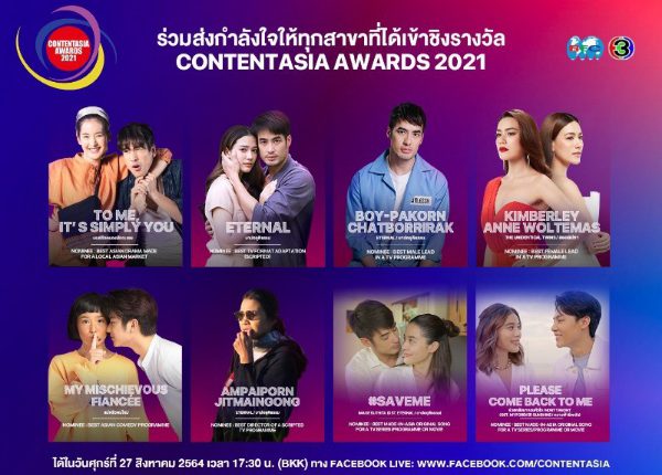 การประกาศผลรางวัล CONTENTASIA AWARDS 2021 กำลังจะมาถึง ซึ่งจัดโดยนิตยสาร ContentAsia ผู้นำสื่อสิ่งพิมพ์และสื่อดิจิทัลในต่างประเทศที่นำเสนอข่าวเชิงลึกเกี่ยวกับความเคลื่อนไหวของตลาดคอนเทนต์ในภูมิภาคเอเชีย เพื่อเป็นการมอบรางวัลอันทรงเกียรติให้กับคอนเทนต์คุณภาพในเอเชียทั้งเบื้องหน้าและเบื้องหลัง จำนวน 21 สาขารางวัล โดยในปีนี้ CONTENTASIA AWARDS ได้ประกาศผู้เข้ารอบสุดท้ายเป็นที่เรียบร้อย “บอย ปกรณ์ ฉัตรบริรักษ์” และ “คิมเบอร์ลี่ แอน โวลเทมัส” มีลุ้นนักแสดงนำชายและนำหญิง ส่วนผลงานละครของช่อง 3 ได้เข้ารอบสุดท้ายถึง 7 สาขารางวัล (8 ชิ้นงาน) ดังนี้