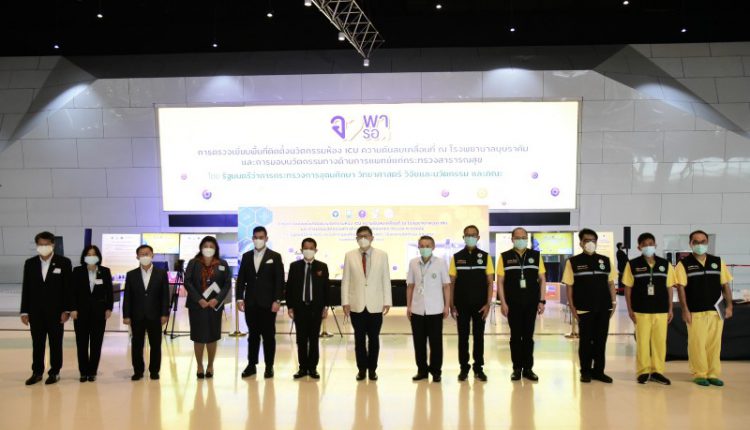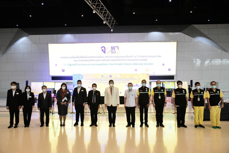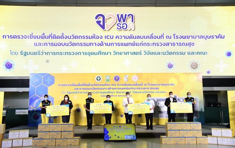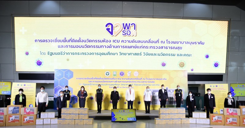 เมื่อวันที่ 19 ส.ค. ศ.(พิเศษ) ดร.เอนก เหล่าธรรมทัศน์ รมว.การอุดมศึกษา วิทยาศาสตร์ วิจัย และนวัตกรรม (อว.) พร้อมด้วย ศ.ดร.นพ.สิริฤกษ์ ทรงศิวิไล ปลัด อว. ผศ.ดร.ดวงฤทธิ์ เบญจาธิกุล เลขานุการ รมว.อว. ดร.ดนุช ตันเทอดทิตย์ ผช.รมว.อว. ดร.วิภารัตน์ ดีอ่อง ผอ.สำนักงานการวิจัยแห่งชาติ(วช.) และผศ.ดร.ณัฐพล ฤกษ์เกษมสันติ์ หัวหน้าโครงการวิจัยและนวัตกรรม ตรวจเยี่ยมพื้นที่ติดตั้งนวัตกรรมห้อง ICU ความดันลบเคลื่อนที่ โรงพยาบาลบุษราคัม พร้อมส่งมอบนวัตกรรมทางด้านการแพทย์แก่กระทรวงสาธารณสุข (สธ.)โดยมี นพ.ธงชัย กีรติหัตยากร รองปลัด สธ. พร้อมด้วย นพ.กิตติศักดิ์ อักษรวงศ์ ผู้ช่วยปลัด สธ. และ ผอ.โรงพยาบาลบุษราคัมให้การต้อนรับ