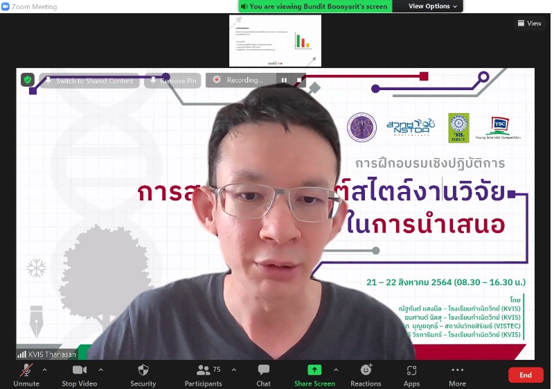 ดร.วิภารัตน์ ดีอ่อง ผู้อำนวยการสำนักงานการวิจัยแห่งชาติ กล่าวว่า วช. ได้ตระหนักถึงความสำคัญในด้านการเตรียมกำลังคนและพัฒนาบุคลากรด้านการวิจัยและนวัตกรรมในทุกช่วงวัย ตั้งแต่ระดับ มัธยมศึกษา อาชีวศึกษา อุดมศึกษา ตลอดจนระดับนักวิจัยและนักประดิษฐ์ ซึ่งเป็นกำลังสำคัญในการขับเคลื่อนประเทศด้านการวิจัยและนวัตกรรมในทักษะด้านต่าง ๆ โดยเฉพาะอย่างยิ่งด้านวิทยาศาสตร์และเทคโนโลยี รวมไปถึงด้านเทคโนโลยีสารสนเทศและการสื่อสาร จึงสนับสนุนทุนให้แก่โครงการ “การพัฒนาและเสริมศักยภาพเยาวชนในรูปแบบการจัดประกวดแข่งขัน” ในการจัดฝึกอบรมเชิงปฏิบัติการออนไลน์ เรื่อง “การสกัดคอนเทนต์สไตล์งานวิจัยเพื่อใช้ในการนำเสนอ” ขึ้น เพื่อพัฒนาศักยภาพครูและนักเรียน ให้มีทักษะในการสื่อสารให้ผู้ฟังสามารถเข้าใจเนื้อหางานวิจัย ความสำคัญของงานวิจัยที่ต้องการนำเสนอได้อย่างชัดเจน และมีประสิทธิภาพ เรียนรู้เทคนิคการวางโครงสร้างเพื่อสร้างเนื้อหาในการนำเสนองานวิจัย และจัดทำเอกสารประกอบการนำเสนอ ตลอดจนเรียนรู้เครื่องมือและเทคนิคการตัดต่อคลิปวิดีโอเพื่อใช้ในการนำเสนอผลงาน ซึ่งเป็นทักษะที่จำเป็นในการขับเคลื่อนงานวิจัยและนวัตกรรมให้มีประสิทธิภาพ ในรูปแบบออนไลน์ ตามมาตรการควบคุมและป้องกัน