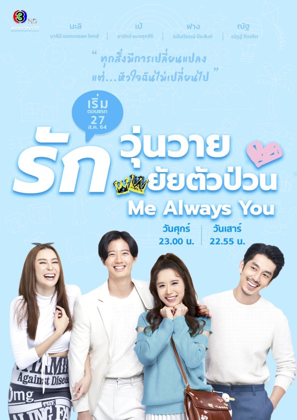 ติดตาม “ Me always You รักวุ่นวาย ยัยตัวป่วน” ซีรีส์โรแมนติคคอมเมดี้เบาสมอง ทุกวันศุกร์ เวลา 23.00-24.00 น. และวันเสาร์ เวลา 22.55-23.55 น. ทางช่อง 3 กด 33 เสนอเป็นตอนแรกวันศุกร์ที่ 27 สิงหาคม 2564 ออกอากาศพร้อมกับสถานนีโทรทัศน์ Anhui TV และสตรีมมิ่งบน Migu Video แพลตฟอร์มรายใหญ่ประเทศจีน