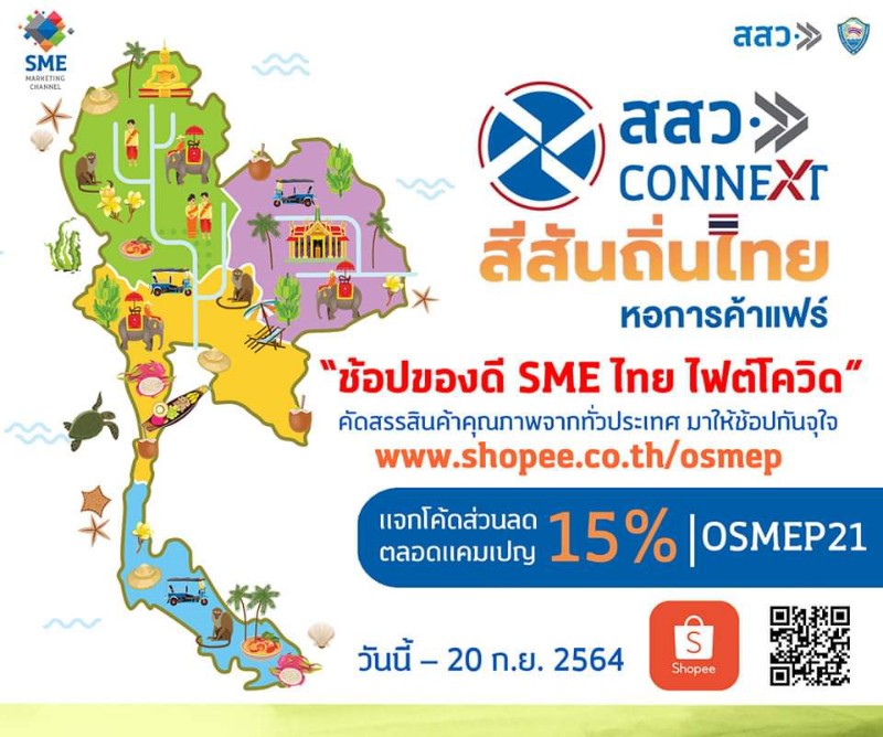 ทั้งนี้ แคมเปญ “ช้อปของดี SME ไทย ไฟต์โควิด” บนแพลตฟอร์ม Shopee ได้คัดสรรสินค้าคุณภาพดีจากผู้ประกอบการ SME ทั่วประเทศ ให้ได้เลือกช้อปกันอย่างจุใจในราคาพิเศษลดสูงสุด 15% ด้วยโค้ดส่วนลด SME21 ที่ https://shopee.co.th/OSMEP ตั้งแต่วันนี้ถึง 20 กันยายน 2564 โดยสามารถดาวน์โหลดช้อปปี้แอพพลิเคชั่นได้ฟรีจาก App Store หรือ Google Play Store