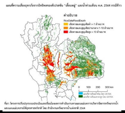 นอกจากนี้ งานวิจัยได้ประเมินผลเสียหายจากน้ำท่วม พบว่า นาข้าวเสียหายกว่า 3.5 ล้านไร่คิดเป็น 1.6 หมื่นล้านบาท โดยใช้ข้อมูลจากดาวเทียมที่แสดงพื้นที่น้ำท่วมและพื้นที่เพาะปลูกข้าวในช่วงเดือนกันยายนถึงเดือนตุลาคมของปี 2564 ของสำนักงานพัฒนาเทคโนโลยีอวกาศและภูมิสารสนเทศ (องค์การมหาชน) หรือ GISTDA พื้นที่ที่ได้รับผลกระทบต่อข้าวมากที่สุดคือ ภาคอีสาน น้ำท่วมข้าวประมาณ 2 ล้านไร่ สำหรับภาคกลางและภาคเหนือ นาข้าวที่ถูกน้ำท่วมประมาณ 1 ล้านและ 5 แสนไร่ตามลำดับ อย่างไรก็ตามความเสียหายจะถูกประเมินจากชนิดของข้าว เช่น ข้าวเจ้าในภาคกลาง ข้าวเหนียวในภาคอีสานตอนบน และข้าวหอมมะลิในภาคอีสานตอนล่าง รวมถึงราคาข้าวในแต่ละชนิด ณ ขณะนั้นโดยใช้ข้อมูลจากสำนักงานเศรษฐกิจการเกษตร