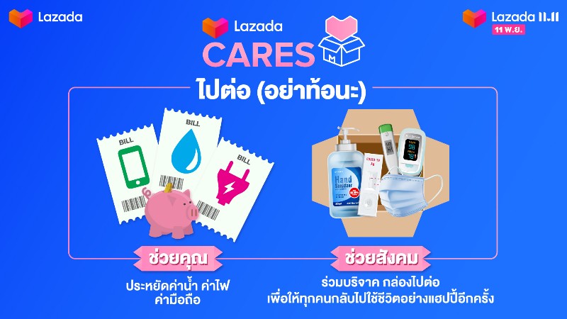 ในช่วงแคมเปญ LazMall 9.9 Mega Brands Sale กล่อง LazadaCARES จำนวน 99,999 กล่องได้ถูกส่งมอบให้กับผู้ที่ได้รับผลกระทบจากโรคโควิด-19 ผ่าน 9 องค์กรการกุศล ลาซาด้าจึงจะต่อยอดโครงการดังกล่าวกับแคมเปญ 11.11 นี้ด้วยเช่นกัน โดยในครั้งนี้ กล่อง LazadaCARES จะบรรจุอุปกรณ์ป้องกันโควิด-19 ที่จำเป็น เช่น ชุดตรวจ RT-Antigen เครื่องวัดออกซิเจน ปรอทวัดไข้ เจลแอลกอฮอล์ และหน้ากากอนามัย ซึ่งจะมีการส่งต่อให้กับผู้ที่เดือดร้อนผ่านความร่วมมือกับมูลนิธิต่างๆ ได้แก่ กลุ่มจิตอาสา Food For Fighters มูลนิธิกระจกเงา มูลนิธิอาสาสมัครเพื่อสังคม เราต้องรอด และเส้นด้าย ผู้บริโภคสามารถร่วมเป็นส่วนหนึ่งของโครงการนี้ผ่านการเปลี่ยนเหรียญ LazCoins จำนวน 11 เหรียญเป็นกล่อง LazadaCARES 1 กล่อง โดยพิมพ์คำว่า “LazadaCARES” บนแถบค้นหาของแอปพลิเคชันลาซาด้า หรือคลิก https://lzd.co/LazadaCARES111121TH