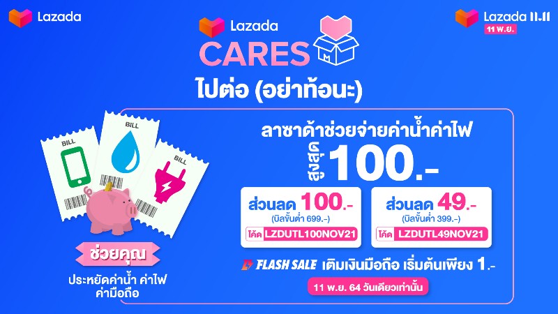 กรุงเทพฯ 3 พฤศจิกายน 2564 – ลาซาด้า ประเทศไทย เปิดตัวมหกรรมช้อปแห่งปี “Lazada 11.11 Our Biggest One-Day Sale ถูกที่สุดในรอบปี วันนี้วันเดียว” ที่มาพร้อมดีลสุดยิ่งใหญ่ที่จะช่วยผู้บริโภคชาวไทยในการปรับตัวสู่วิถีชีวิตแบบ ‘นิวนอร์มอล’ กันอีกครั้ง ในขณะเดียวกัน โครงการ “LazadaCARES ไปต่อ อย่าท้อนะ” ซึ่งต่อยอดจากกิจกรรมที่ริเริ่มขึ้นในช่วงแคมเปญ LazMall 9.9 Mega Brands Sale ยังจะใช้โอกาสนี้ในการผลักดันการส่งต่อกล่องแห่งความห่วงใยให้กับผู้ที่ขาดแคลน โดยภายในกล่องประกอบด้วยอุปกรณ์และผลิตภัณฑ์ที่จำเป็น เช่น หน้ากากอนามัยและชุดตรวจโควิด-19 เพื่อเสริมการป้องกันให้กับผู้ที่ได้รับความเดือดร้อน ในช่วงเวลาที่หลายคนเตรียมออกจากบ้านไปทำงานอีกครั้ง