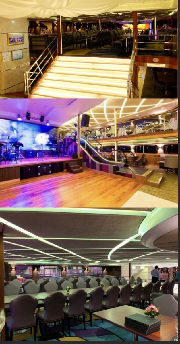 เพียงก้าวเข้ามาภายในเรือก็จะพบกับความสวยงามของการตกแต่งและแสงไฟ รวมไปถึงความกว้างขวางโดยจะเป็นบริเวณชั้น 2 ของเรือที่แยกเป็นซ้ายขวาที่ใช้โต๊ะและที่นั่งแบบใหญ่มาตรฐานและโซฟานั่งสบาย มีการจัดวางแบบกระจายไม่แออัด สามารถต่อโต๊ะยาวรองรับกลุ่มใหญ่เป็นสิบคนได้สบาย และทางลงไปชั้น 1 ซึ่งเป็นชั้นที่วิวเลียบไปกับพื้นน้ำให้ความสวยงามไปอีกแบบและยังเป็นชั้นที่ตั้งเวทีการแสดงดนตรีสดพร้อมฟลอร์เต้นรําอีกด้วย