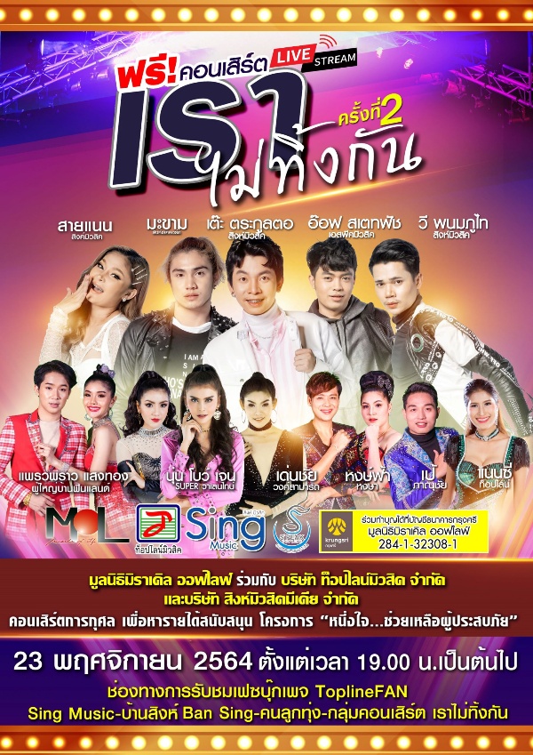 คุณณฐพบ ซาเนตร ผู้บริหาร บริษัท สิงห์ มิวสิค มีเดีย จำกัด เผยว่า ในครั้งนี้ ทางค่ายบ้านสิงห์ ก็ได้ส่งศิลปินในค่ายมาร่วมงานในครั้งนี้ มีคุณเต๊ะ ตระกูลตอ, วี พนมภูไท , สายแนน สิงห์มิวสิค,อ๊อฟ สเตทฟัช เอสพีคมิวสิค,มะขาม สิงห์เรคคอร์ด โดยสามารถติดตามรับชม Live สด ผ่าน เพจ Facebook Topline Fan,เพจ Facebook บ้านสิงห์,เพจ MOL เราไม่ทิ้งกัน,เพจ คนลูกทุ่งและ เพจ Facebook มูลนิธิมิราเคิล ออฟไลฟ์ @MOLfoundation ในวันที่ 23 พฤศจิกายน 2564 ตั้งแต่เวลา 19.00 น. เป็นต้นไป รวมถึงมาตรการป้องกันไวรัสโคโรนา2019 ( Covid -19 ) ทางมูลนิธิ มิราเคิล ออฟไลฟ์ และบริษัท ท็อปไลน์ มิวสิค จำกัด มีระบบการป้องกันอย่างพร้อมเพรียง มีการคัดกรอง ศิลปินที่ร่วมขับร้อง คอนเสิร์ตการกุศล ในครั้งนี้ด้วย