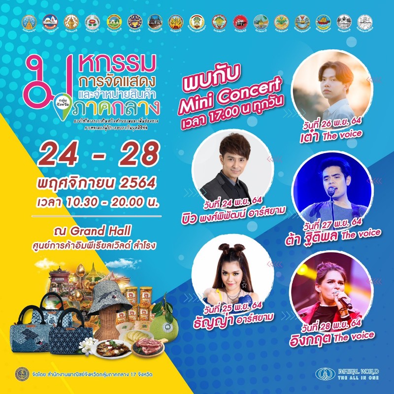 สำนักงานพาณิชย์จังหวัดกลุ่มภาคกลาง 17 จังหวัด จัดงาน “มหกรรมการจัดแสดงและจำหน่ายสินค้าของกลุ่มจังหวัดภาคกลาง” ซึ่งจัดขึ้นทั้งหมด 5 วัน ระหว่างวันที่ 24 – 28 พฤศจิกายน 2564 ณ GRAND HALL ศูนย์การค้าอิมพีเรียล เวิลด์ สำโรง ห้ามพลาด!! จัดใหญ่รวมของดี สินค้าดังช้อปได้ในงานนี้งานเดียวทั้ง 17 จังหวัดกลุ่มภาคกลาง คาดรายได้สะพัดไม่น้อยกว่า 4 ล้าน หวังสร้างโอกาสเพิ่มรายได้พร้อมช่วยกระตุ้นเศรษฐกิจฐานรากให้เข้มแข็งอย่างยั่งยืน