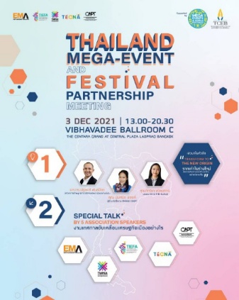 สำนักงานส่งเสริมการจัดประชุมและนิทรรศการ (องค์การมหาชน) หรือ TCEB สนับสนุนจัดกิจกรรม “THAILAND MEGA-EVENT AND FESTIVAL PARTNERSHIP MEETING” สร้างเครือข่ายระหว่างผู้จัดงานอีเวนต์ขนาดใหญ่ร่วมเป็นหัวหอกอัปเกรดความคิดสร้างสรรค์ที่แปลกใหม่อย่างมีเอกลักษณ์เฉพาะตัว ต่อยอดไปสู่การขับเคลื่อนเมืองผ่านงานเทศกาลในอนาคต เพิ่มมูลค่าอันเกิดจากอัตลักษณ์ของเมือง หวังกระตุ้นเศรษฐกิจและผลักดัน การพัฒนาอย่างยั่งยืน