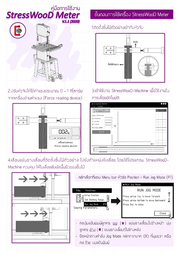จุดเด่นของสิ่งประดิษฐ์ “เครื่องวัดความเค้นในไม้แปรรูปอุตสาหกรรมความแม่นยำสูง” ประกอบด้วย 2 ส่วนหลัก คือ StressWooD-Machine เป็นเครื่องมือที่ทำการผ่าครึ่งชิ้นไม้ตัวอย่างพร้อมกับวัดค่าแรงคืนตัวที่ระยะผ่า