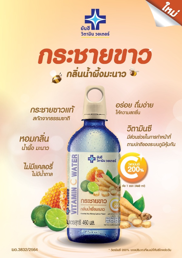 บริษัท ยันฮี วิตามิน วอเตอร์ จำกัด ผู้ผลิตและจัดจำหน่าย “ยันฮี วิตามิน วอเตอร์ เครื่องดื่มวิตามิน ที่ถูกคิดค้น พัฒนาโดยทีมแพทย์ และนักโภชนาการ” ขอแนะนำ “ยันฮี วิตามินซี วอเตอร์ กระชายขาว กลิ่นน้ำผึ้งมะนาว” น้ำดื่มผสมวิตามินเพื่อสุขภาพ อุดมด้วยวิตามินซี 200% พร้อมสกัดจากกระชายขาวแท้ 100% มีฤทธิ์ต้านทานสูง ประกอบด้วยสารสำคัญ 2 ชนิด ได้แก่ Panduratin A และ Pinostrobin ซึ่งมีฤทธิ์ฆ่าเชื้อในหลอดทดลองอย่างได้ผล ช่วยเสริมภูมิคุ้มกัน รสชาติอร่อย ดื่มง่าย มีกลิ่นหอมสดชื่นของน้ำผึ้งมะนาว ไม่มีน้ำตาล ไม่มีแคลอรี่ ผ่านการตรวจคุณภาพมาตรฐาน GHP/HACCP และ GMP จากสถาบัน URS รับรองโดย อ.ย. พร้อมกับใบอนุญาตการผลิตอาหารจากคณะกรรมการอาหารและยา ดื่มได้ทุกวัย เครื่องดื่มประจำบ้าน ดื่มดี มีวิตามิน