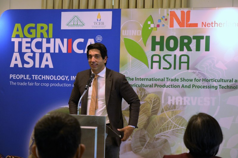 ดร. Gijs Theunissen DVM อัครราชทูตที่ปรึกษา (ฝ่ายเกษตร) สถานเอกอัครราชทูต เนเธอร์แลนด์ ประจำประเทศไทย กล่าวว่า “สำหรับประเทศเนเธอร์แลนด์ ความท้าทายระดับโลกคือ การหาแหล่งอาหารที่ปลอดภัยและยั่งยืน โดยการเชื่อมโยงระหว่างอาหาร การเกษตร จีโนม และเทคโนโลยี สิ่งเหล่านี้ล้วนมีความสำคัญอย่างยิ่ง สิ่งที่สำคัญมากเช่นกัน คือ การผลิตโดยคำนึงถึงปัจจัยอื่นๆ อาทิ ภาวะโลกร้อน ดังนั้นเรามีการปรับใช้เทคโนโลยีต่างๆ เข้ามาช่วย โดยภาคเอกชน ได้ร่วมมือกันกับสถาบันวิจัยและองค์กรภาครัฐอย่างใกล้ชิด เพื่อพัฒนาการปลูกพืชสวนต่อไป ซึ่งในงาน HORTI ASIA เกษตรกรสามารถเรียนรู้แนวคิดใหม่ๆ ในการแก้ปัญหาทางธุรกิจ รวมทั้งทำความเข้าใจเกี่ยวกับการปลูกพืชสวนอย่างยั่งยืนให้มากขึ้นอีกด้วย”