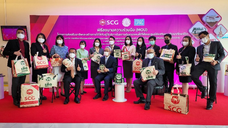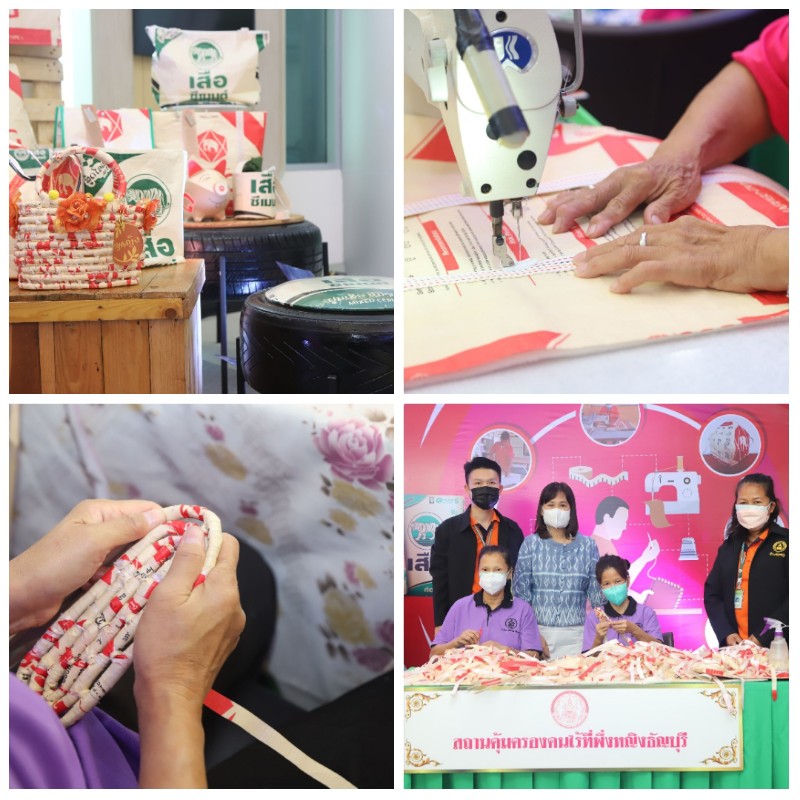 “พม. ร่วมกับ เอสซีจี โดย บริษัท ผลิตภัณฑ์และวัตถุก่อสร้าง จำกัด สร้างมูลค่าเพิ่มให้กับถุงปูนซีเมนต์รอการทำลาย ส่งเสริมอาชีพและสร้างรายได้ให้กับคนไร้ที่พึ่ง “