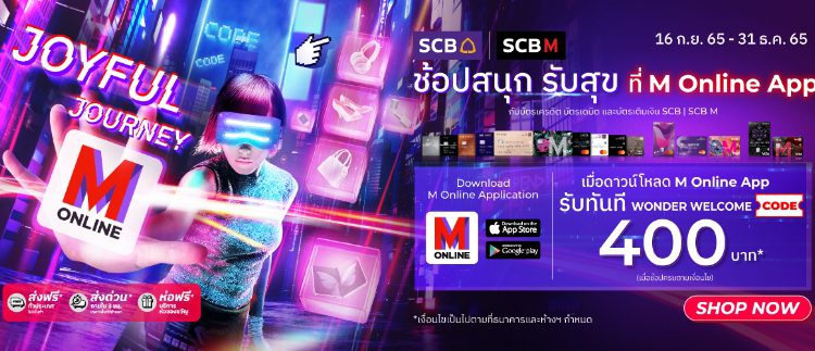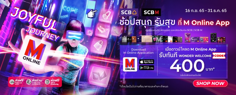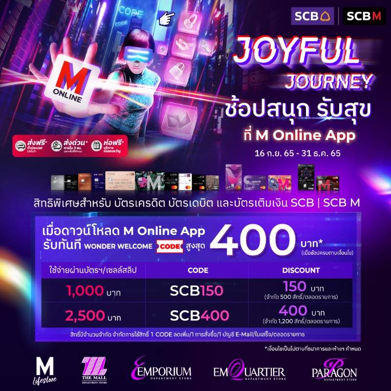 M Online โดย เดอะมอลล์ กรุ๊ป ผนึกกำลังพันธมิตร ธนาคารไทยพาณิชย์ จำกัด (มหาชน) ฉลองเปิดตัว M ONLINE APP อยู่ที่ไหนก็ช้อปได้ตลอด 24 ชั่วโมง จัดแคมเปญ “SCB I SCB M JOYFUL JOURNEY” เอาใจขาช้อปออนไลน์ มอบสิทธิประโยชน์สุดพิเศษเฉพาะลูกค้าผู้ถือบัตรเครดิต บัตรเดบิต และบัตรเติมเงิน SCB M และ SCB ด้วยแคมเปญ JOYFUL JOURNEY แจก Wonder Welcome Code สูงสุดถึง 16% ยาวต่อเนื่อง ตั้งแต่วันที่ 15 มิ.ย. 2565 ที่ผ่านมา จนถึง 31 ธ.ค. 2565