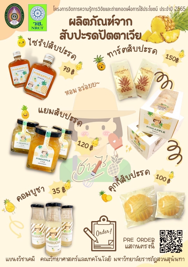 สำนักงานการวิจัยแห่งชาติ ( วช.) กระทรวงการอุดมศึกษา วิทยาศาสตร์ วิจัยและนวัตกรรม ให้การสนับสนุนทีมวิจัยจากมหาวิทยาลัยราชภัฏสวนสุนันทา ในการผลิตคิดค้นนวัตกรรมผลิตภัณฑ์แปรรูปจากสับปะรดปัตตาเวียและบรรจุภัณฑ์จากของเหลือทิ้งทางการเกษตร เพื่อแก้ปัญหาสินค้าล้นตลาดและราคาตกต่ำในฤดูการเก็บผลผลิตโดยเฉพาะในพื้นที่ภาคตะวันออก จังหวัดระยอง ซึ่งเป็นพื้นที่การปลูกสับปะรดแหล่งใหญ่แห่งหนึ่งของประเทศ นอกจากนี้จากสถานการณ์การแพร่ระบาดของเชื้อไวรัสโควิด-19 ที่ผ่านมาทำให้ผู้ค้าสับปะรดต่างจังหวัดไม่เข้ามารับซื้อสับปะรดในจังหวัดระยอง ทำให้ปริมาณสับปะรดเกินความต้องการของโรงงานแปรรูปในพื้นที่ อีกทั้งโรงงานยังประสบปัญหาการส่งออกต่างประเทศ