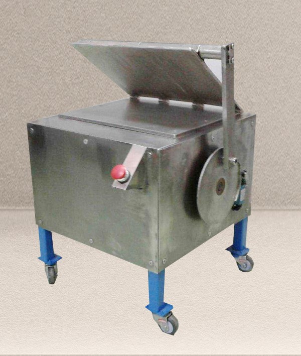 3) เครื่องทับกล้วยแบบกึ่งอัตโนมัติ สำหรับใช้ในกระบวนการผลิตกล้วยแผ่นม้วน เพื่อทับกล้วยให้เป็นแผ่นแบนก่อนจะนำไปอบแห้ง ช่วยให้กล้วยแผ่นมีความบางสม่ำเสมอ ก่อนจะนำไปม้วนเป็นผลิตภัณฑ์กล้วยม้วน อัตราการผลิต 500 ผลต่อชั่วโมง