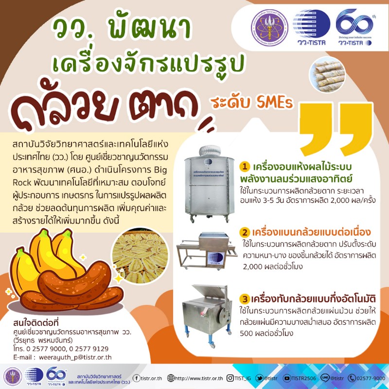 กระทรวงการอุดมศึกษา วิทยาศาสตร์ วิจัยและนวัตกรรม (อว.) สถาบันวิจัยวิทยาศาสตร์และเทคโนโลยีแห่งประเทศไทย (วว.) โดย ศูนย์เชี่ยวชาญนวัตกรรมอาหารสุขภาพ (ศนอ.) ภายใต้ โครงการวิทย์สร้างอาชีพ ยกระดับภูมิภาค (Big Rock) ขับเคลื่อนเศรษฐกิจและสังคมฐานราก โดยการนำวิทยาศาสตร์ เทคโนโลยี และงานวิจัยนวัตกรรม เข้าไปช่วยพัฒนาต่อยอดภูมิปัญญาท้องถิ่น เพื่อลดต้นทุนการผลิต เพิ่มคุณค่าและสร้างรายได้ให้เพิ่มมากขึ้น ประสบผลสำเร็จในการวิจัยและพัฒนา “เครื่องจักรแปรรูปกล้วยตากระดับ SMEs” จำนวน 3 เครื่อง ดังนี้