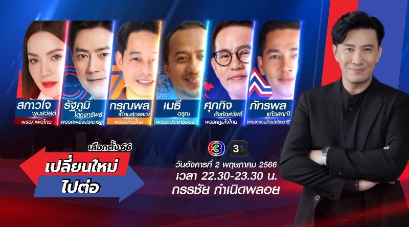 2 พฤษภาคม 2566 เข้มข้นกับ “หนุ่ม กรรชัย กำเนิดพลอย” นำทีม “เปลี่ยนใหม่ หรือ ไปต่อ” ช่อง 3 เจาะขบวนพาเหรดคนบันเทิงลงสมัครการเมืองไทย มาดูกันว่าดาราที่จะมาเป็น ส.ส. “บุคคลเหล่านี้ จะพาเราไปต่อได้จริงหรือ ดารากับการเมือง เป็นแค่ไม้ประดับ หรือต้นสักที่แข็งแกร่ง” มาวัดกึ๋นพวกเขาเหล่านี้บนเวที ช่อง 3 โดยมีศิลปินดารา จาก 6 พรรคการเมือง ร่วมถกปัญหาและตอบปัญหา ดังนี้