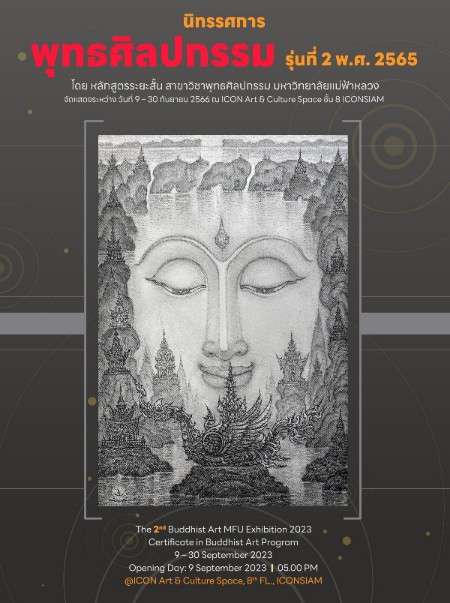 มหาวิทยาลัยแม่ฟ้าหลวง (มฟล.) ร่วมกับ วัดร่องขุ่น และศูนย์วิปัสสนาสากลไร่เชิญตะวัน ขอเชิญชมการจัดแสดงผลงานศิลปะของผู้เรียนหลักสูตรระยะสั้น สาขาวิชาพุทธศิลปกรรม รุ่นที่ 2 พ.ศ. 2565 ร่วมกับผลงานของผู้ทรงคุณวุฒิประจำหลักสูตร เพื่อเผยแพร่ผลงานศิลปกรรมให้เป็นที่ประจักษ์ต่อสาธารณะ ระหว่างวันที่ 9 – 30 กันยายน 2566 ณ ICON Art & Culture Space ชั้น 8 ไอคอนสยาม กรุงเทพฯ โดยไม่เสียค่าใช้จ่าย
