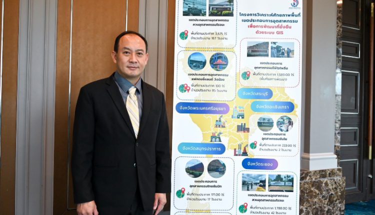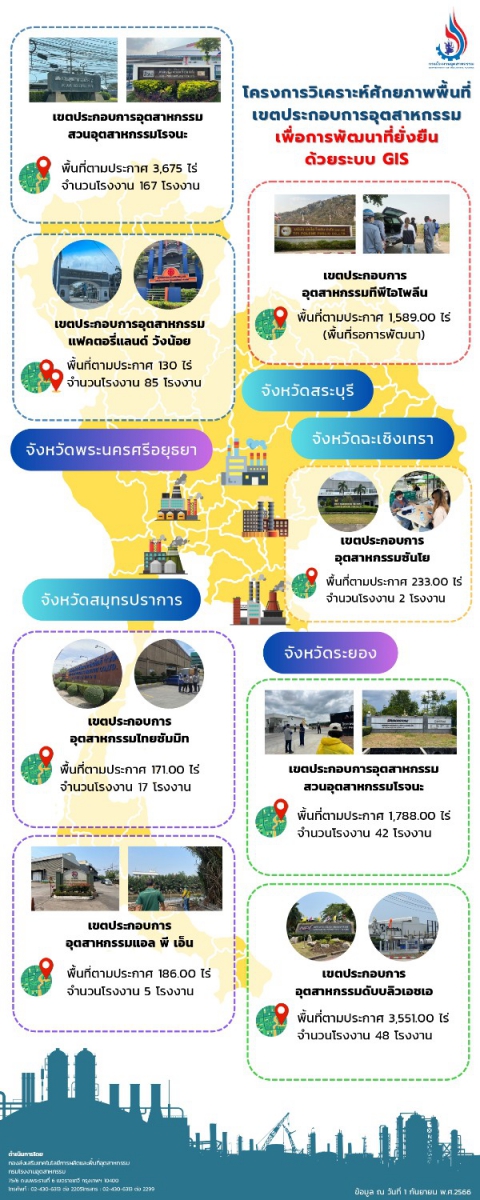 นายวีรพงษ์ เอี่ยมเจริญชัย รองอธิบดีกรมโรงงานอุตสาหกรรม กระทรวงอุตสาหกรรม กล่าวว่า กรมโรงงานอุตสาหกรรม โดยกองส่งเสริมเทคโนโลยีการผลิตและพื้นที่อุตสาหกรรม ได้ร่วมกับ บริษัท ฟิกท์ แอสโซซิเอท จำกัด ในการศึกษา “โครงการวิเคราะห์ศักยภาพพื้นที่เขตประกอบการอุตสาหกรรมเพื่อการพัฒนาที่ยั่งยืน ด้วยระบบ GIS (ภายใต้ค่าใช้จ่ายในการพัฒนาพื้นที่อุตสาหกรรมเพื่อรองรับการลงทุน)” ในเขตประกอบการอุตสาหกรรมที่มีศักยภาพในการพัฒนา จำนวน 8 เขตประกอบการ ใน 5 จังหวัด ประกอบด้วย