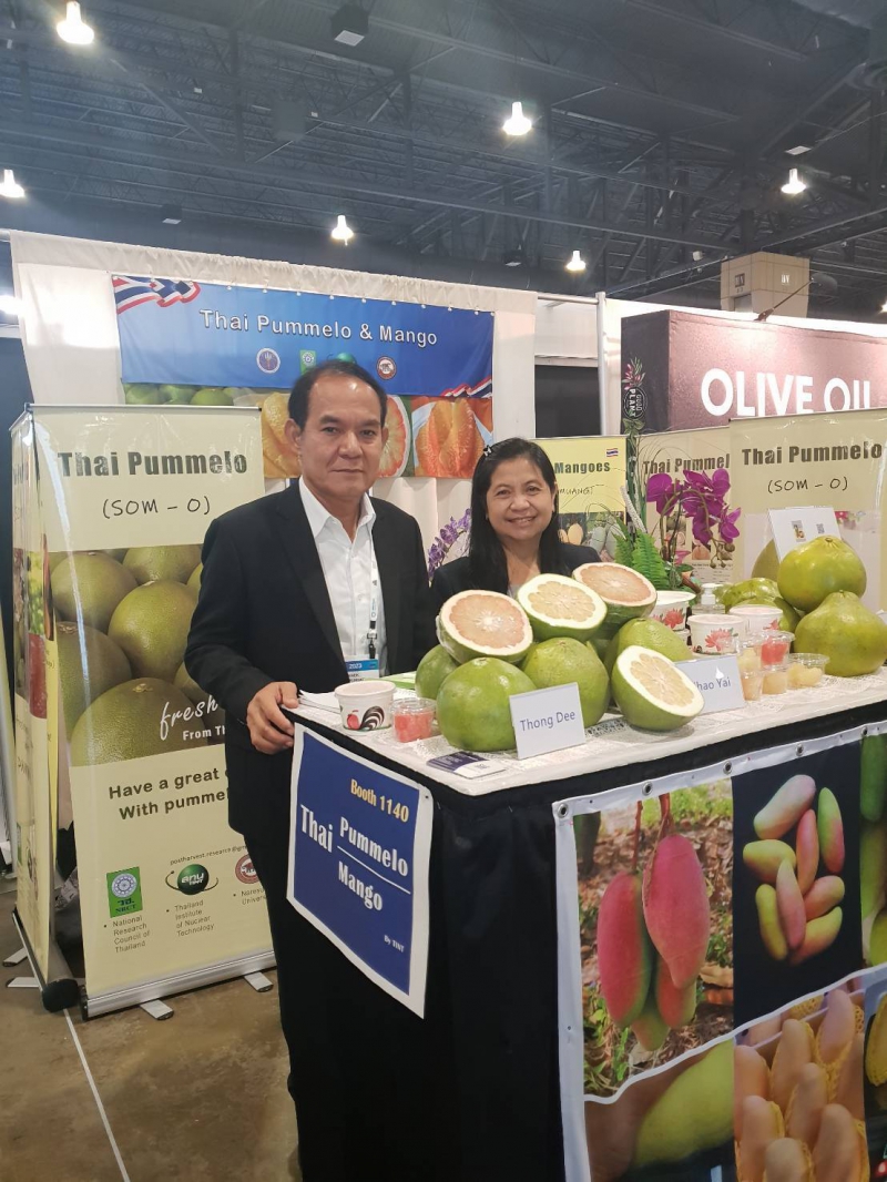 สำหรับงาน Natural Products Expo East นั้น เป็นงานที่จัดขึ้นเป็นประจำทุกปีในช่วงฤดูใบไม้ร่วง (Fall) ของประเทศสหรัฐอเมริกา เป็นงานแสดงเกี่ยวกับอุตสาหกรรมผลิตภัณฑ์จากธรรมชาติ ผลิตภัณฑ์เกษตรอินทรีย์ ผัก ผลไม้ ผลิตภัณฑ์เพื่อสุขภาพ และผลิตภัณฑ์อาหารเสริมต่างๆ จัดขึ้น ณ เมืองฟิลาเดลเฟีย รัฐเพนซิลเวเนีย ประเทศสหรัฐอเมริกา ในระหว่างวันที่ 20 – 23 กันยายน พ.ศ. 2566 มีผู้แสดงสินค้ากว่า 1,500 ราย จากหลายประเทศทั่วโลก มีผู้เข้าร่วมแสดงผลงาน (ผู้เชี่ยวชาญด้านอุตสาหกรรม) กว่า 29,000 ราย เป็นงานแสดงสินค้าที่มีศักยภาพสูงและคาดว่าจะมีผู้เข้าร่วมงานเพื่อเจรจาธุรกิจจากทั้งในสหรัฐอเมริกาและประเทศต่างๆ ทั่วโลก ไม่ต่ำกว่า 50,000 คน โดย วช. และทีมวิจัยจึงนำส้มโอจำนวน 4 สายพันธุ์ ได้แก่ ทองดี ขาวแตงกวา ขาวใหญ่ และทับทิมสยาม ไปออกบูธเพื่อเปิดตัว นำเสนอ และแนะนำส้มโอไทยให้ผู้บริโภคได้รู้จัก ได้ทดลองชิมรสชาติ พบว่า ผู้บริโภคให้การยอมรับและชื่นชอบรสชาติและสีสันของส้มโอไทยเป็นอย่างมาก นอกจากนี้ยังได้พบและเจรจาการค้ากับภาคเอกชนในหลายประเทศ เป็นการสร้างเครือข่ายกับผู้ขายในอุตสาหกรรมเดียวกัน ทำให้สามารถเปิดตลาดสหรัฐฯ ได้เพิ่มมากขึ้น