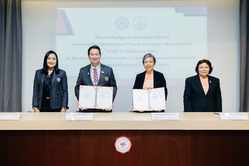 วันที่ 28 พฤศจิกายน 2566 – กรุงเทพฯ มหาวิทยาลัยศรีนครินทรวิโรฒ (มศว) จัดพิธีลงนามความร่วมมือทางวิชาการ โดยมี รองศาสตราจารย์ ดร.สมชาย สันติวัฒนกุล อธิการบดี มศว ลงนามความร่วมมือทางวิชาการกับ ผู้ช่วยศาสตราจารย์ ดร.ยุวดี วิริยางกูร นายกสมาคมครูการศึกษาพิเศษไทย เมื่อวันที่ 28 พฤศจิกายน 2566 เวลา 10.00 – 12.00 น. ณ มศว ประสานมิตร กทม. โดยมีความมุ่งหวังร่วมกันว่าจะสร้างเครือข่ายการศึกษาและพัฒนายกระดับ “ครูวิเศษสอนเด็กพิเศษ” ให้เกิดประโยชน์แก่บุคลากรทางการศึกษาอย่างยั่งยืน