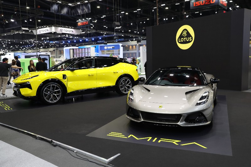 สำหรับภายในงาน Motor Expo 2023 ทาง โลทัส คาร์ ไทยแลนด์ ได้นำรถยนต์มาจัดแสดงเอาใจกลุ่มคนรักรถสปอร์ตชาวไทย จำนวน 3 คัน โดยมี 2 รุ่นเรือธงที่เป็นไฮไลท์สำหรับปีนี้อย่าง Lotus Eletre รถไฟฟ้า100% ถือเป็น Hyper-SUV Full Electric 100% คันแรกของค่าย ซึ่งได้รับการตอบรับที่ดีเกินคาด ด้วยจุดแข็งที่ตอบโจทย์คนรุ่นใหม่ที่ให้ความสำคัญกับฟังก์ชันและสมรรถนะการขับขี่ระดับเวิลด์คลาส ที่ถือว่าเป็นรถไฟฟ้าที่เร็วที่สุดในโลก พร้อมดีไซน์ที่สวยงามโดดเด่น ด้วยราคาเริ่มต้น 5.89 ล้านบาท ทำให้สามารถดันยอดขายเกินเป้ากว่า 150 คัน คาดว่าจะสามารถปิดยอดขายในปีนี้ที่ 200 คัน จากที่ตังเป้าไว้ 100 คันต่อปี โดยจะเริ่มส่งมอบรถลอตแรกได้ภายในปีนี้จำนวน 20 คัน ส่วนที่เหลือคาดว่าจะส่งมอบได้ในไตรมาสแรกของปี 2567 อีกหนึ่งรุ่นไฮไลท์ในงานคือ Lotus Emira รถสปอร์ตพรีเมียมขนาดเล็กที่ถือได้ว่าเป็นรถยนต์ Lotus ที่ดีที่สุดเท่าที่เคยมีมา และยังเป็นรถยนต์รุ่นสุดท้ายของ Lotus ที่ขับเคลื่อนด้วยเครื่องยนต์สันดาปภายใน ที่พร้อมให้เป็นเจ้าของแบบเอ็กซ์คลูซีฟในงานนี้เท่านั้น ด้วยราคาเริ่มต้นอยู่ที่ 9.99 ล้านบาท