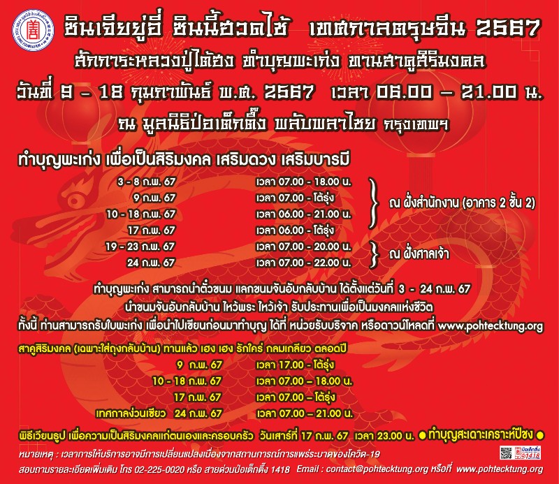 ระหว่างวันที่ 9 – 18 กุมภาพันธ์ 2567 มูลนิธิป่อเต็กตึ๊ง โดยนายวิเชียร เตชะไพบูลย์ ประธานกรรมการ ขอเชิญทุกท่าน ร่วม “สักการะหลวงปู่ไต้ฮง” ขอพรเนื่องในเทศกาลตรุษจีนเพื่อความเป็นสิริมงคลต้อนรับปีใหม่ ลงชื่อ สวดชัยมงคลคาถา หรือ “พะเก่ง” เพื่อสะเดาะเคราะห์ ขอให้ครอบครัวมีสุข เสริมโชคลาภ เสริมดวงชะตา เสริมความมั่นคงสถาพร ตลอดปี รวมถึงทำบุญสะเดาะเคราะห์และเสริมความเป็นสิริมงคลกับรูปปั้นนักษัตรปีมะโรง ซึ่งได้ผ่านการทำพิธีเบิกเนตรโดยพระอาจารย์จีนคณาณัติจีนพรต (เย็นงี้) เจ้าอาวาสวัดมังกรกมลาวาส (วัดเล่งเน่ยยี่) พร้อม รับประทาน “สาคูสิริมงคล” เพื่อความกลมเกลียวและอยู่เย็นเป็นสุข อัญเชิญ “ฮู้แดง” (ยันต์) ของหลวงปู่ไต้ฮง เพื่อนำไปประทับหน้าบ้าน เคหะสถาน หรือพกติดตัวเพื่อคุ้มครอง “เคาะระฆังทอง”ให้ก้องกังวานเพื่อให้ชีวิตสดใส การงานรุ่งเรืองระบือไกล และ ร่วม “พิธีเวียนธูปศักดิ์สิทธิ์” เพื่อขอพรเทพยดาฟ้าดินเนื่องในวันประสูติ (ทีกงแซ) ซึ่งในปีนี้ตรงกับวันเสาร์ที่ 17 กุมภาพันธ์ 2567 ขออำนาจฟ้าดินเป็นที่พึ่ง ขอให้สิ่งศักดิ์สิทธิ์ที่ตนนับถือ เช่น หลวงปู่ไต้ฮง ช่วยดลบันดาลให้ประสบโชคดีตลอดปีใหม่ (โดยในวันที่ 9 และ 17 กุมภาพันธ์ 2567 มูลนิธิป่อเต็กตึ๊ง เปิดบริการโต้รุ่ง)