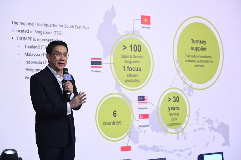 มร.ฟิลิป เมเยอร์ ผู้บริหารบริษัท ทรุ้มพ์ฟ จำกัด ประจำภาคพื้น เอเชีย เปิดเผยว่า จากการที่อุตสาหกรรมโลหการในประเทศไทยมีแนวโน้มการเติบโตขึ้นอย่างต่อเนื่อง ซึ่งปัจจัยหลักที่สำคัญอย่างเครื่องจักรและเทคโนโลยีที่เหมาะสมในการพัฒนาภาคการผลิตอย่างมีประสิทธิภาพ “ทรุ้มพ์ฟ” (TRUMPF) ในฐานะผู้นำนวัตกรรมที่นำเสนอโซลูชันด้วยเทคโนโลยีขั้นสูงสำหรับเครื่องจักรเพื่อการแปรรูปโลหะแผ่น เทคโนโลยีเลเซอร์ อิเล็กทรอนิกส์ และอุตสาหกรรม 4.0 เรามีความภูมิใจที่เป็นผู้อยู่เบื้องหลังของนวัตกรรมที่ผลักดันเทคโนโลยีสู่โลกอนาคต เพื่อสร้างสรรค์เทคโนโลยีใหม่ ๆ ผลักดันอุตสาหกรรมไปข้างหน้าในแบบอย่างที่ไม่เคยมีมาก่อนให้เป็นจริง โดยเฉพาะเทคโนโลยีที่กำลังเข้ามามีบทบาทในการขับเคลื่อนภาคอุตสาหกรรมในหลายประเทศทั่วโลกรวมทั้งประเทศไทย และกำลังเป็นที่น่าจับตามอง ได้แก่ เทคโนโลยีปัญญาประดิษฐ์ AI ควอนตัมเทคโนโลยี เทคโนโลยีที่เชื่อมต่อโลกเข้ากับมนุษย์ และเทคโนโลยีโรงงานอัจฉริยะที่มีความยั่งยืน หรือ Smart Factory