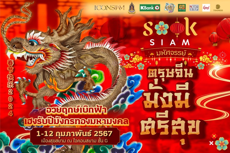 เมืองสุขสยาม ณ ไอคอนสยาม ผงาดฟ้ารับศักราชใหม่ ต้อนรับปีมังกรทองมหามงคล ผนึกพันธมิตร ได้แก่ กระทรวงวัฒนธรรม, ไอคอนสยาม, ธนาคารกสิกรไทย จำกัด (มหาชน) , บริษัท โออิชิ เทรดดิ้ง จำกัด ผู้ผลิตและจัดจำหน่ายเครื่องดื่มสมุนไพรจับเลี้ยงแบรนด์ จับใจ, บริษัท ไทย อกริ ฟู้ด จำกัด (มหาชน) กะทิเรียลไทย และบริษัท เนกซ์สเตป จำกัด จัดงาน “สุขสยาม มหัศจรรย์ ตรุษจีน มั่งมีศรีสุข” เสริมสิริมงคลไหว้เทพเจ้ารับความเฮงปีมังกร อิ่มอร่อยกับเมนูอาหารมงคลหลากหลาย และตื่นตาตื่นใจกับการแสดงโชว์เชิดพญามังกรทองจักรพรรดิคาบสมุทร พร้อมกิจกรรมรับความเฮงอีกมากมาย ระหว่างวันที่ 1 – 12 กุมภาพันธ์ 2567