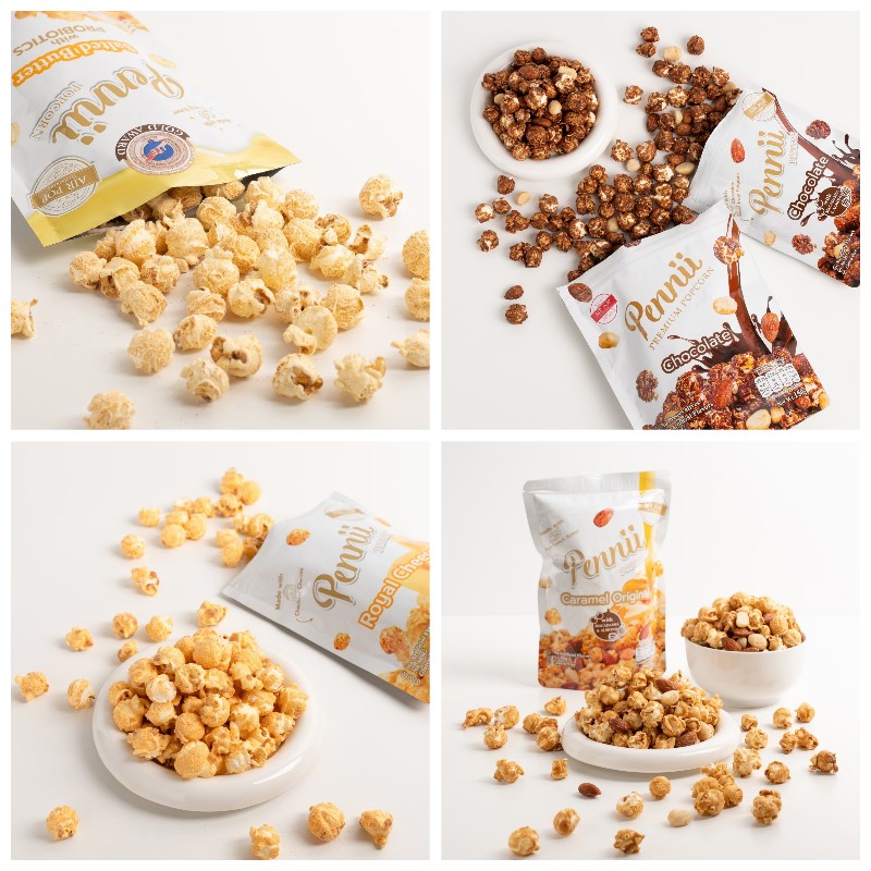 แบรนด์ Pennii Premium Popcorn มีวิสัยทัศน์ในการส่งต่อรอยยิ้มและความสุขให้กับผู้คนทั่วโลกผ่านผลิตภัณฑ์ป๊อปคอร์นคุณภาพสูง ปัจจุบันมีทั้งหมด 8 รสชาติ ได้แก่ Caramel, Chocolate, Low Sugar, Monthong Durian, Salted Egg, Royal Cheese, Tom Yum Goong และ Salted Butter Probiotics ที่เพิ่งได้รับรางวัลเหรียญทองด้านนวัตกรรมจากประเทศอังกฤษ