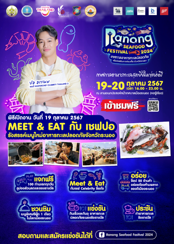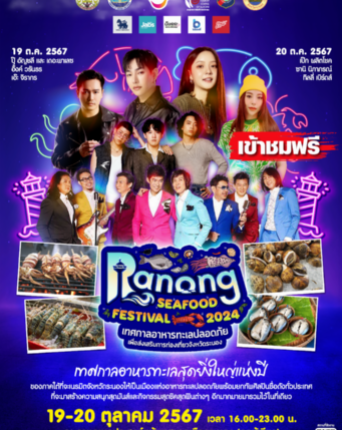 งานเทศกาลอาหารทะเลปลอดภัย “RANONG SEAFOOD FESTIVAL 2024” นำเสนอภายใต้แนวคิด RANONG SEAFOOD FESTIVAL 2024 จังหวัดระนองเป็น “เมืองประมง” ที่มีทรัพยากรธรรมชาติ ทางทะเลที่อุดมสมบูรณ์ ทั้งรสชาติและเมนูอาหารเอกลักษณ์ ที่มีความโดดเด่น และสร้างชื่อเสียงให้กับจังหวัดระนองมาอย่างต่อเนื่อง และช่วงเดือนตุลาคมของทุกปี คือช่วงเวลาที่ท้องทะเลฝั่งอันดามันเข้าสู่ช่วงเปิดฤดูกาลของการรับประทานอาหารทะเล ปูไข่ก็จะเริ่มวางไข่ กุ้ง หอย ปู ปลาทะเล ก็จะเข้าสู่ช่วงของการสะสมไขมันทำให้รสชาติของอาหารทะเล มีรสชาติที่อร่อยที่สุดในรอบปีของการบริโภค เราจะนำเสนอเทศกาลอาหารทะเลที่ดีที่สุดในบรรยากาศของโลกใต้ทะเลที่สวยงาม โดยมีการจัดกิจกรรมที่น่าสนใจมากมาย บูธร้านอาหารทะเลกว่า 50 ร้านค้า อร่อยต้องห้ามพลาด ชวนชิมข้าวผัดกาหยูซีฟูัดระนอง เมนูเดียวในโลกโดยการรังสรรค์จากเชฟชื่อดัง (เชฟปอ อรรณพ แชมป์รายการ MasterChef Celebrity Thailand 2) ชิมฟรี 100 เสิร์ฟเท่านั้น และฟรีคอนเสิร์ตจากศิลปินชื่อดังที่จะมาสร้างความสนุกในงาน วันเสาร์ที่ 19 ตุลาคม 2567 พบกับ ปุ๊ อัญชลี วง THE PALACE , อิ้งค์ วรันธร , เอ๊ะ จิรากร และวันอาทิตย์ที่ 20 ตุลาคม 2567 พบกับ เป๊ก ผลิตโชค, ซานิ , วงทิลลี่เบิร์ดส์ และวงที่ได้รับรางวัลระดับประเทศ พร้อมการแข่งขันประชันทำอาหารพื้นเมืองจากวัตถุอาหารทะเลชิงรางวัล การแข่งขันกินจุกินเร็วอาหารทะเลปลอดภัยระนองชิงเงินรางวัล เล่นเกมส์ ลุ้นรับคูปองซื้อสินค้าภายในงานฟรีและการประดับประดาตกแต่งไฟทั่วบริเวณงานอย่างสวยงาม