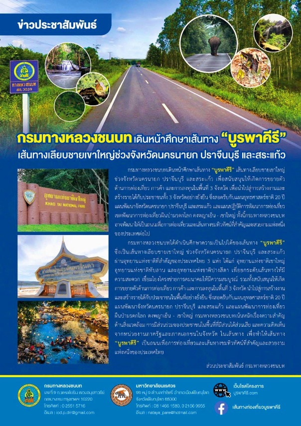 กรมทางหลวงชนบทเดินหน้าศึกษาเส้นทาง “บูรพาคีรี” เส้นทางเลียบชายเขาใหญ่ ช่วงจังหวัดนครนายก ปราจีนบุรี และสระแก้ว เพื่อสนับสนุนให้เกิดการขยายตัว