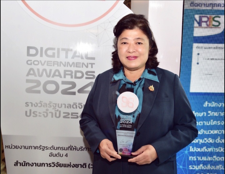 ดร.วิภารัตน์ ดีอ่อง ผู้อำนวยการสำนักงานการวิจัยแห่งชาติ เข้าร่วมรับโล่รางวัลและประกาศนียบัตร จาก นายประเสริฐ จันทรรวงทอง รองนายกรัฐมนตรี และรัฐมนตรีว่าการกระทรวงดิจิทัลเพื่อเศรษฐกิจและสังคม ในงานมอบรางวัลรัฐบาลดิจิทัล ประจำปี 2567 “DG Awards 2024” ณ ตึกสันติไมตรี ทำเนียบรัฐบาล ซึ่งในปีนี้ เป็นปีที่ 4 ที่ วช. เป็นรางวัลอันทรงเกียรติและภาคภูมิใจ สะท้อนความมุ่งมั่นพัฒนางานบริการด้านดิจิทัล โดยมุ่งเน้นยกระดับระบบบริการสำหรับกลุ่มเปราะบาง พัฒนาสังคมสูงวัย สร้างการมีส่วนร่วม สำหรับประชาชน นักวิจัย หน่วยงานในระบบวิจัย มุ่งนำผลงานวิจัย องค์ความรู้จากงานวิจัย นำสู่การใช้ประโยชน์ในการพัฒนาประเทศได้ทุกมิติ