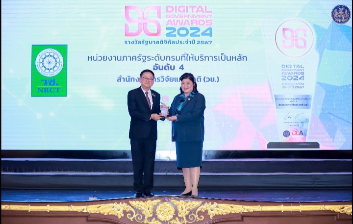 วันที่ 27 ธันวาคม 2567 สำนักงานการวิจัยแห่งชาติ (วช.) กระทรวงการอุดมศึกษา วิทยาศาสตร์ วิจัยและนวัตกรรม เข้ารับรางวัลรัฐบาลดิจิทัล ประจำปี 2567 (Digital Government Award 2024) หรือ DG Awards 2024 จัดโดย สำนักงานพัฒนารัฐบาลดิจิทัล (องค์การมหาชน) สพร. ย้ำชัดความสำเร็จในการพัฒนาระบบดิจิทัลเพื่อให้บริการนักวิจัยและประชาชนอย่างต่อเนื่อง ด้วย 2 รางวัล แห่งความภาคภูมิใจ ดังนี้ “รางวัลรัฐบาลดิจิทัล (Digital Government Awards) หน่วยงานภาครัฐระดับกรมที่ให้บริการเป็นหลัก อันดับ 4″ และ “รางวัลหน่วยงานคุณภาพด้านส่งเสริมการมีส่วนร่วมผ่านช่องทางอิเล็กทรอนิกส์ (e-Participation) หน่วยงานระดับกรม ที่ให้บริการเป็นหลัก”