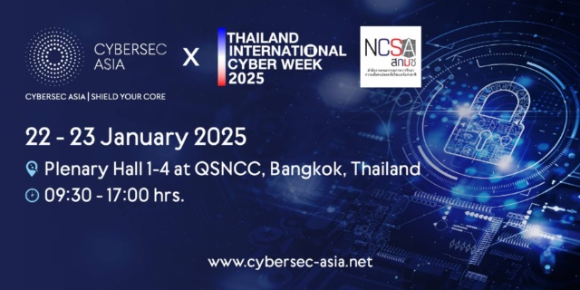 งาน Cybersec Asia x Thailand International Cyber Week 2025 ซึ่งได้รับการสนับสนุนจากสำนักงานความปลอดภัยทางไซเบอร์แห่งชาติ (NCSA) โดยงานจะถูกจัดขึ้นวันที่ 22-23 มกราคม 2568 ที่ศูนย์การประชุมแห่งชาติสิริกิติ์ (QSNCC) งานนี้ได้รวบรวมสัมมนาจากแหล่งอินไซต์ ผู้ประกอบการจากองค์กรชั้นนำ และโซลูชันนวัตกรรมที่เกี่ยวกับความปลอดภัยทางไซเบอร์