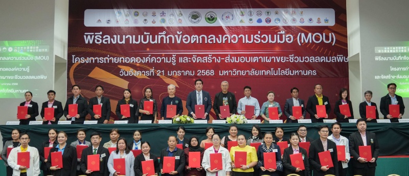 กรุงเทพฯ, 21 มกราคม 2568 – รองศาสตราจารย์ ดร.ภานวีย์ โภไคยอุดม อธิการบดีมหาวิทยาลัยเทคโนโลยีมหานคร (มทม.) ในฐานะประธานคณะขับเคลื่อนการมีส่วนร่วมเพื่อการพัฒนาเขตหนองจอก (คคพ.เขตหนองจอก) จัดพิธีลงนามบันทึกข้อตกลงความร่วมมือ (MOU) โครงการถ่ายทอดองค์ความรู้และจัดสร้าง-ส่งมอบเตาเผาขยะชีวมวลลดมลพิษ ระหว่าง คคพ.เขตหนองจอก กับโรงเรียนเครือข่ายในสังกัดกรุงเทพมหานคร เขตหนองจอก จำนวน 37 แห่ง โดยมี นางสาวยุวนุช นงพรมมา ผู้อำนวยการเขตหนองจอก ร่วมเป็นสักขีพยาน พร้อมด้วย นายวรเกียรติ สุจิวโรดม ‘นักธุรกิจเจ้าของชาวนามหานคร’ประธานเครือข่ายกสิกรรมธรรมชาติ และหัวหน้าโครงการถ่ายทอดองค์ความรู้และจัดสร้าง-ส่งมอบเตาเผาขยะชีวมวลลดมลพิษ อาจารย์โกศล แสงทอง ผู้นำเสนอแนวคิดนำเตาเผาขยะชีวมวลลดมลพิษมาใช้ และผู้อำนวยการสถานศึกษา คณะครู และนักเรียน จากโรงเรียนเครือข่ายในสังกัดกทม. เขตหนองจอก ตลอดจนคณะกรรมการ คคพ.เขตหนองจอก กว่า 400 คน เข้าร่วมงาน ณ ห้อง Auditorium ชั้น 5 อาคาร MIIX มหาวิทยาลัยเทคโนโลยีมหานคร