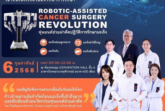 ราชวิทยาลัยจุฬาภรณ์ ขอเชิญผู้ป่วยมะเร็ง ญาติ และผู้ที่สนใจเข้าร่วม กิจกรรมเนื่องในวันมะเร็งโลก CRA United by Unique Against Cancer “เอาชนะมะเร็งด้วยสหวิทยาการรักษา” ROBOTIC-ASSISTED CANCER SURGERY REVOLUTION (หุ่นยนต์ช่วยผ่าตัดปฏิวัติการรักษามะเร็ง) มะเร็งต่อมลูกหมาก มะเร็งลำไส้ใหญ่ มะเร็งตับ มะเร็งตับอ่อน