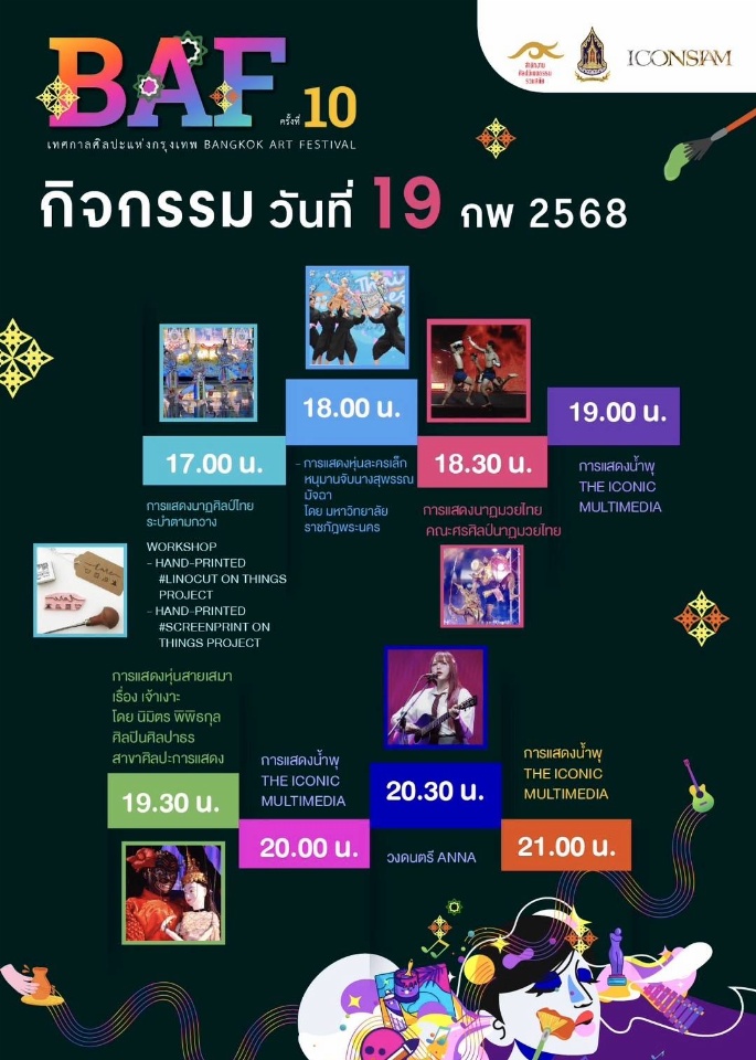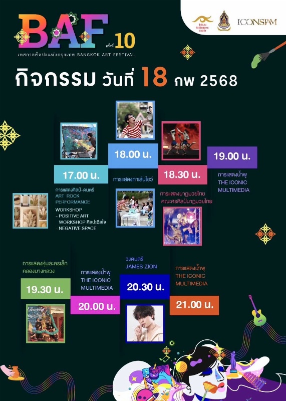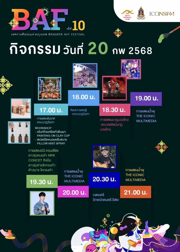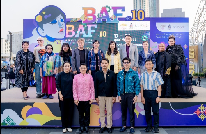 สำนักงานศิลปวัฒนธรรมร่วมสมัย (สศร.) กระทรวงวัฒนธรรม ร่วมกับ ไอคอนสยาม ชวนยกระดับความคิดสร้างสรรค์ ขับเคลื่อนเศรษฐกิจด้วยวัฒนธรรม ผ่านการจัดเทศกาลศิลปะแห่งกรุงเทพฯ หรือ Bangkok Art Festival (BAF) ครั้งที่ 10 ระหว่างวันที่ 17 – 23 กุมภาพันธ์ 2568 เวลา 16.00 – 22.00 น. ณ ริเวอร์พาร์ค ไอคอนสยาม