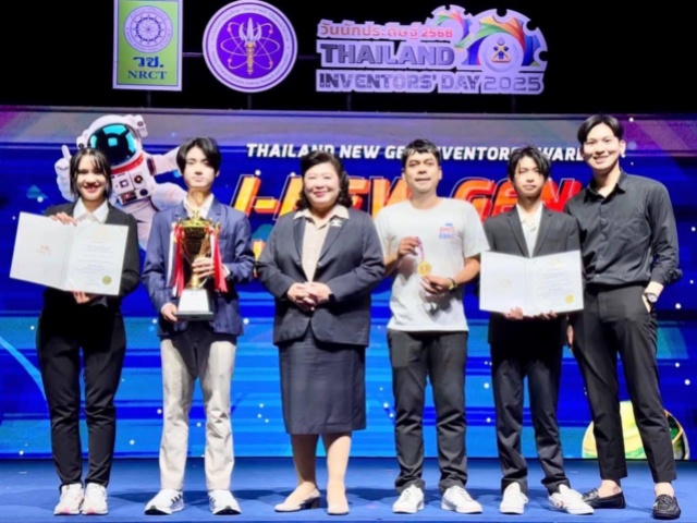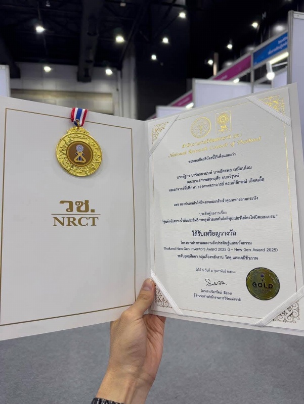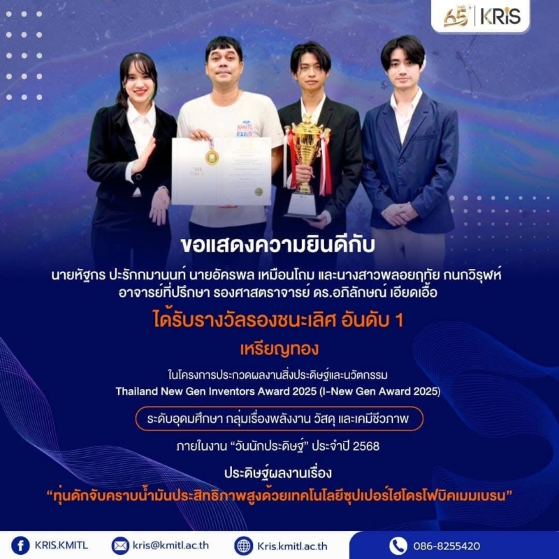 ขอแสดงความยินดีกับนักศึกษาจากสถาบันเทคโนโลยีพระจอมเกล้าเจ้าคุณทหารลาดกระบัง (สจล.) ที่ได้รับรางวัลเหรียญทองรางวัลรองชนะเลิศอันดับ 1 จากการประกวดโครงการสิ่งประดิษฐ์และนวัตกรรม “I -New Gen Award 2025” ภายในงาน “วันนักประดิษฐ์ 2568 (Thailand inventors’ day 2025) เป็นผลงานที่ได้รับรางวัลระดับอุดมศึกษากลุ่มเรื่องพลังงานวัสดุและเคมีชีวภาพ โดยผลงานที่ได้รับรางวัลคือ “ทุ่นดักจับคราบน้ำมันประสิทธิภาพสูงด้วยเทคโนโลยีซุปเปอร์ไฮโดรโฟบิคเมมเบรน” ซึ่งเป็นนวัตกรรมที่ช่วยแก้ปัญหามลพิษทางน้ำได้อย่างมีประสิทธิภาพ