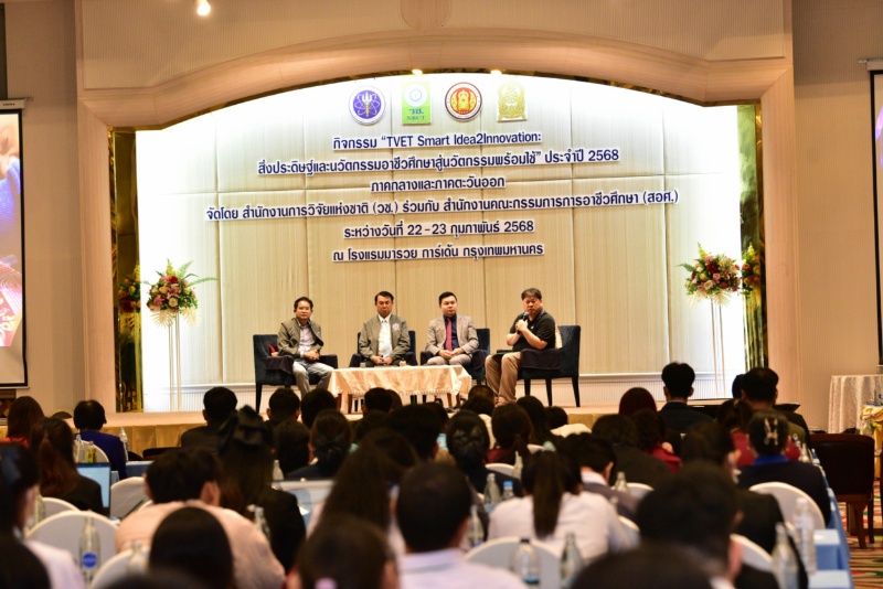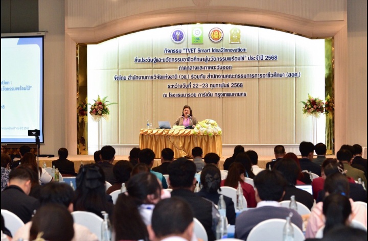 วันที่ 22 กุมภาพันธ์ 2568 สำนักงานการวิจัยแห่งชาติ(วช.) กระทรวงการอุดมศึกษา วิทยาศาสตร์ วิจัยและนวัตกรรม ร่วมกับ สำนักงานคณะกรรมการการอาชีวศึกษา จัดกิจกรรม “TVET Smart Idea2Innovation : สิ่งประดิษฐ์และนวัตกรรมและนวัตกรรมอาชีวศึกษาสู่นวัตกรรมพร้อมใช้” ครั้งที่ 1 โดย ดร.วิภารัตน์ ดีอ่อง ผู้อำนวยการสำนักงานการวิจัยแห่งชาติ ให้เกียรติเป็นประธานในพิธีเปิด และปาฐกถาพิเศษเรื่อง “TVET Smart Idea2Innovation : บ่มเพาะ เสริมแกร่ง พัฒนาบุคลากรอาชีวศึกษา สู่นวัตกรรมพร้อมใช้” พร้อมด้วย ดร.นิรุตต์ บุตรแสนลี ผู้อำนวยการสำนักวิจัยและพัฒนาการอาชีวศึกษา สำนักงานคณะกรรมการการอาชีวศึกษา กล่าวบรรยายพิเศษ เรื่อง “ปลดล็อกศักยภาพ สร้างชาติด้วยนวัตกรรม : บทบาทของอาชีวศึกษาในการขับเคลื่อน TVET Smart Idea2Innovation” ณ โรงแรมมารวยการ์เด้น กรุงเทพมหานคร