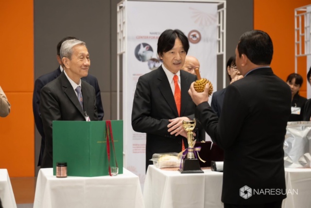 รศ ดร พีระศักดิ์ ฉายประสาท ถวายรายงานการใช้เทคนิคการทำนายคุณภาพของทุเรียนหมอนทองด้วยเทคนิคเทคนิคเนียร์อินฟราเรดสเปกโทรสโกปี (NIR) การยืดอายุทุเรียนตัดแต่ง (fresh cut) และส่งเสด็จ (ภาษาญี่ปุ่น) เจ้าฟ้าชายฟุมิฮิโตะ อากิชิโนะโนะมิยะ พระยุพราชแห่งญี่ปุ่น ในโอกาสที่มหาวิทยาลัยนเรศวร ถวายปริญญาปรัชญาดุษฎีบัณฑิตกิตติมศักดิ์ สาขาวิชาสัตวศาสตร์