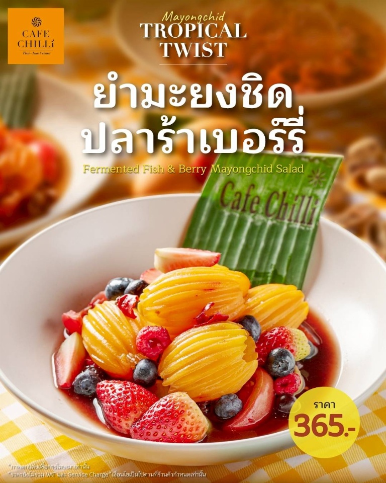 ซัมเมอร์นี้ เริ่มต้นคลายร้อนกับเมนู จากร้าน “Café Chilli” ร้านอาหารอีสานต้นตำรับสุดแซ่บ ชวนคลายร้อนด้วยเมนู ‘ยำมะยงชิดปลาร้าเบอร์รี’ มะยงชิดนครนายกลูกโต ๆ หวานฉ่ำเต็มคำ ผสมผสานรสชาติจัดจ้านของปลาร้าหอม ๆ และเบอร์รีรสเปรี้ยวหวานลงตัว