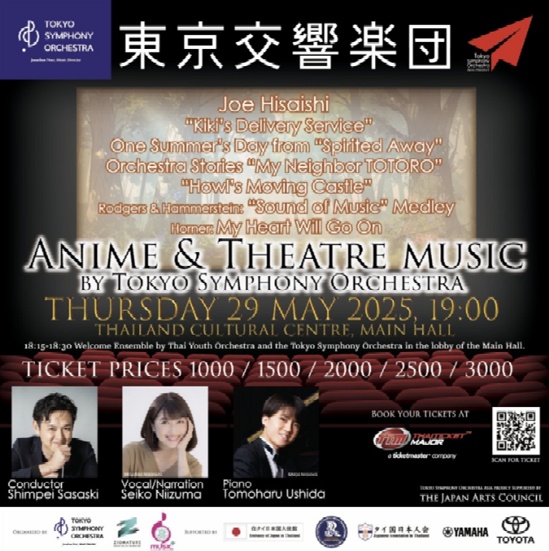 คอนเสิร์ตที่สอง: ANIME & THEATRE MUSIC CONCERT by Tokyo Symphony Orchestra วันพฤหัสบดีที่ 29 พฤษภาคม 2568 เวลา 19:00 น. ณ ศูนย์วัฒนธรรมแห่งประเทศไทย ค่ำคืนแห่งความบันเทิงที่จะพาผู้ชมเดินทางผ่านเสียงดนตรีจากแอนิเมะและละครเวทีชื่อดัง นำโดยวาทยกร “ชิมเป ซาซากิ” (Shimpei Sasaki) ร่วมด้วยนักแสดงมิวสิคัลชื่อดัง “เซย์โกะ นิอิซึมะ” (Seiko Niizuma) ซึ่งมีความผูกพันเป็นพิเศษกับประเทศไทย และศิลปินเปียโน “โทโมฮารุ อุชิดะ”