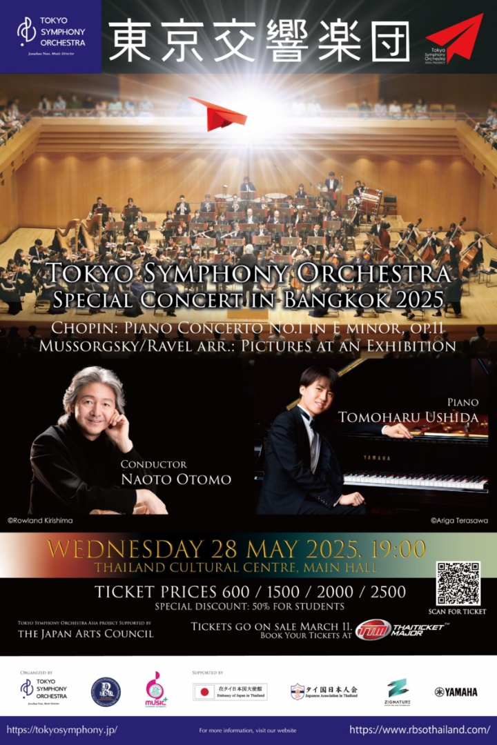 คอนเสิร์ตแรก: TOKYO SYMPHONY ORCHESTRA SPECIAL CONCERT IN BANGKOK 2025 วันพุธ ที่ 28 พฤษภาคม 2568 เวลา 19:00 น. ณ ศูนย์วัฒนธรรมแห่งประเทศไทย พบกับบทเพลงคลาสสิกสุดไพเราะ อาทิ Frederic Chopin: Piano Concerto No.1 in E minor, Modest Mussorgsky / Arr. Maurice Ravel: Pictures at an Exhibition นำโดยวาทยกรมากประสบการณ์ “นาโอโตะ โอโตโมะ” (Naoto Otomo) และศิลปินเปียโนมากฝีมือ “โทโมฮารุ อุชิดะ” (Tomoharu Ushida) ซึ่งมีผลงานระดับนานาชาติตั้งแต่อายุเพียง 12 ปี