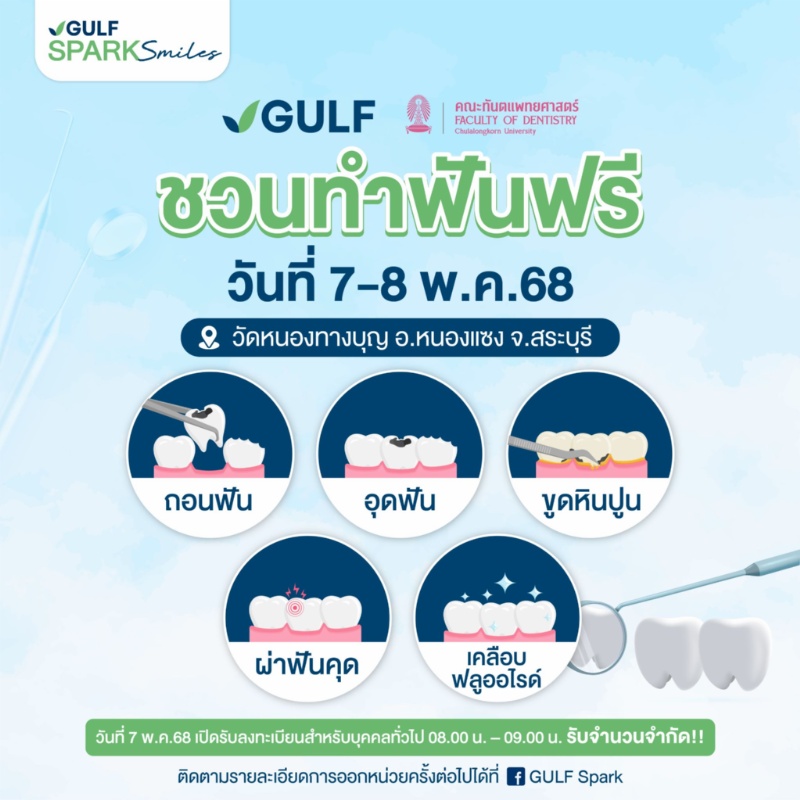 บริษัท กัลฟ์ ดีเวลลอปเมนท์ จำกัด (มหาชน) หรือ กัลฟ์ ร่วมกับ คณะทันตแพทยศาสตร์ จุฬาลงกรณ์มหาวิทยาลัย เตรียมเดินหน้าสานต่อโครงการออกหน่วยทันตกรรมเคลื่อนที่ “GULF Sparks Smiles มอบรอยยิ้มสดใสให้ชุมชน ปี 5” หน่วยที่ 2 ที่จะเดินทางไปมอบความสุข และสร้างรอยยิ้มให้กับชุมชน ณ วัดหนองทางบุญ อ.หนองแซง จ.สระบุรี ในวันที่ 7-8 พ.ค.68 และจะเปิดรับลงทะเบียนสำหรับผู้ที่ walk-in ในช่วงเวลา 8.00 – 9.00 น. ของวันที่ 7 พ.ค. เท่านั้น (รับจำนวนจำกัด) โดยจะให้บริการด้านทันตกรรมทั้ง ขูดหินปูน อุดฟัน ถอนฟัน ผ่าฟันคุด และเคลือบฟลูออไรด์ แบบไม่มีค่าใช้จ่าย
