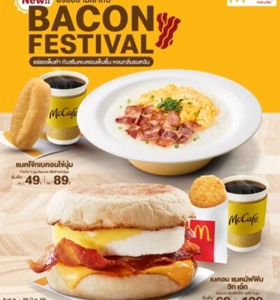 แมคโดนัลด์ เปิดตัวเมนูมื้อเช้าใหม่ แคมเปญ “Bacon Festival” ‘แมคโจ๊กเบคอนไข่นุ่ม’ และ ‘เบคอน แมคมัฟฟิน วิท เอ้ก’ อร่อยเต็มคำกับสโมคเบคอนเต็มชิ้น