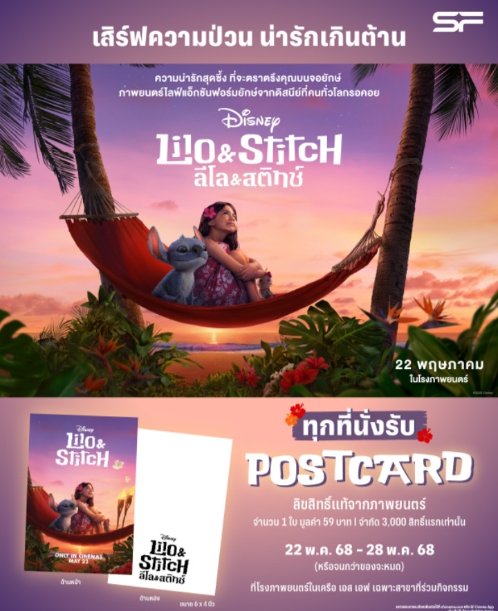 - เมื่อซื้อบัตรชมภาพยนตร์ “Disney’s Lilo & Stitch ลีโลแอนด์สติทช์” รอบปกติทุกที่นั่งรับ Postcard จำนวน 1 ใบ ตั้งแต่วันที่ 22-28 พฤษภาคม 2568 หรือจนกว่าของจะหมด